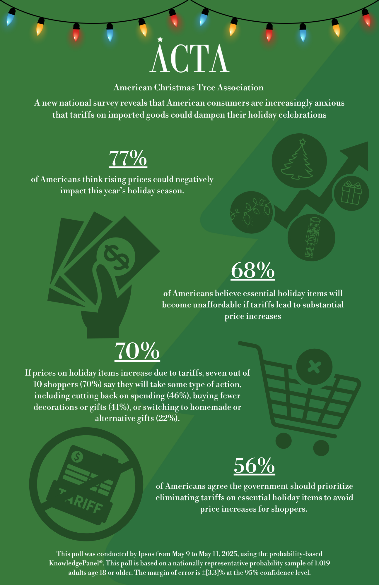 Sacramento, CA – June 2, 2025 - A new national survey reveals that American consumers are increasingly anxious that tariffs on imported goods could dampen their holiday celebrations. The poll, conducted by Ipsos on behalf of the American Christmas Tree Association (ACTA) found that over half (61%) of respondents are concerned that tariffs will have an effect on Christmas — from the availability of decorations, toys and electronics to being able to afford the holiday season.